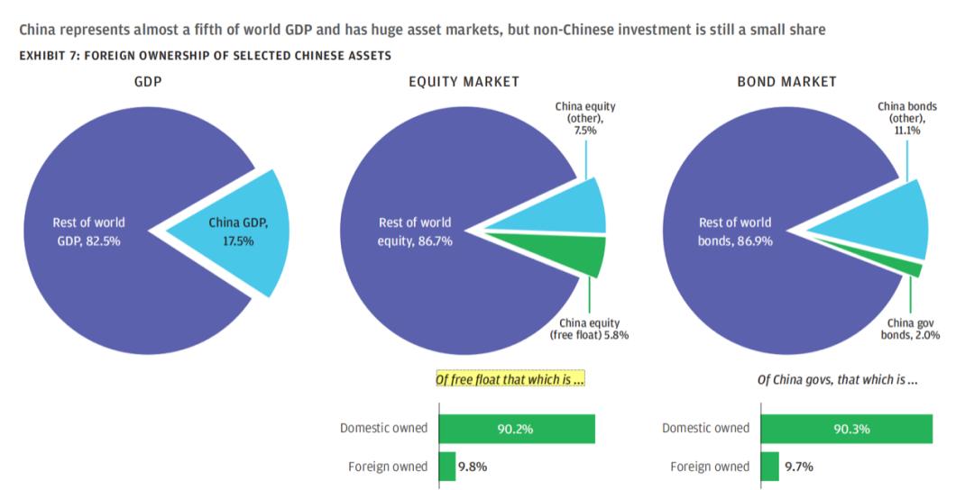 整体看, 国际机构对中国资产和A股的配置远远落后于中国经济在全球的份额。数据显示,国际机构投资者投资中国的总敞口占其总资产的4.6%,且其中很大一部分可能来自中国的海外股票,因为各机构主要通过新兴市场策略投资中国,大部分分配给MSCI新兴市场指数。虽然中国占MSCI新兴市场指数的34%左右,但中国A股的权重仅为5%左右。