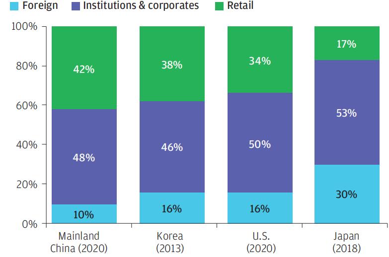 中国散户在主要经济体中占比较高(绿色:散户占比 ,紫色:机构,蓝色:外资)
