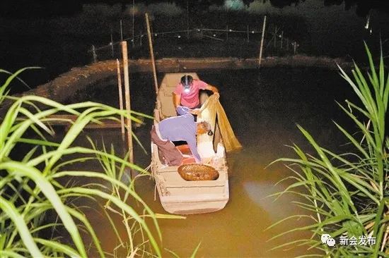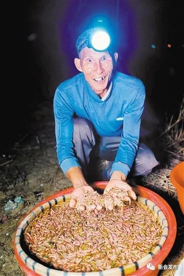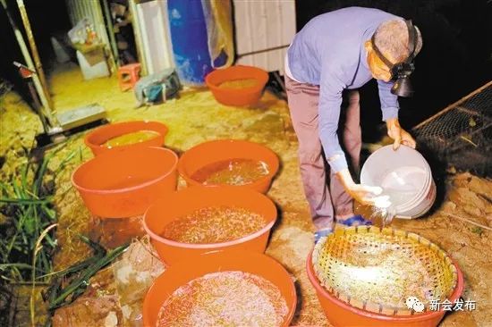 近日,记者跟随农户叶先生来到新会三江镇的江边,通宵达旦拍摄捕禾虫的过程。只见叶先生和父亲已提前在江边堆好一个“围堰”,并在“围堰”口布网。等待一段时间后,禾虫就跟着水流大量出现,顺利进入早已设置在“围堰”口的网中。一晚上父子二人共捕获禾虫数百斤,收获颇丰。