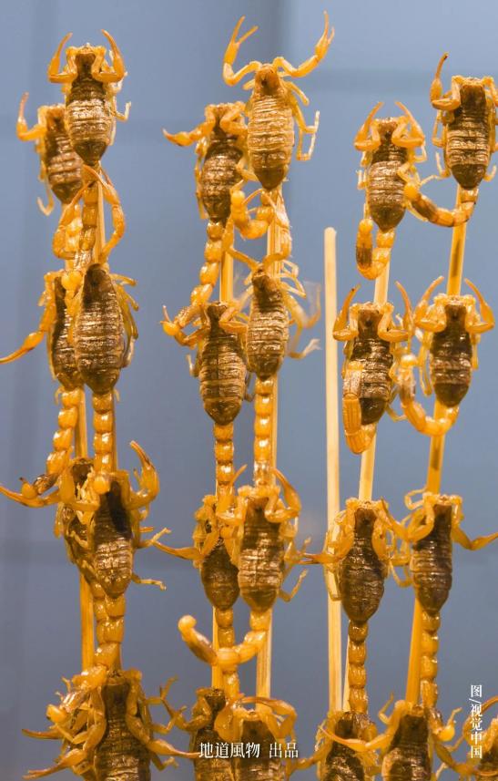如果知了猴相对温和的外貌还能让各地人民稍微理解一下山东人对虫食的喜爱,那么盘子里挥舞着两只钳子、翘着带毒尾针的蝎子就只能让大家对山东人增添一丝莫名其妙的“敬佩”了。