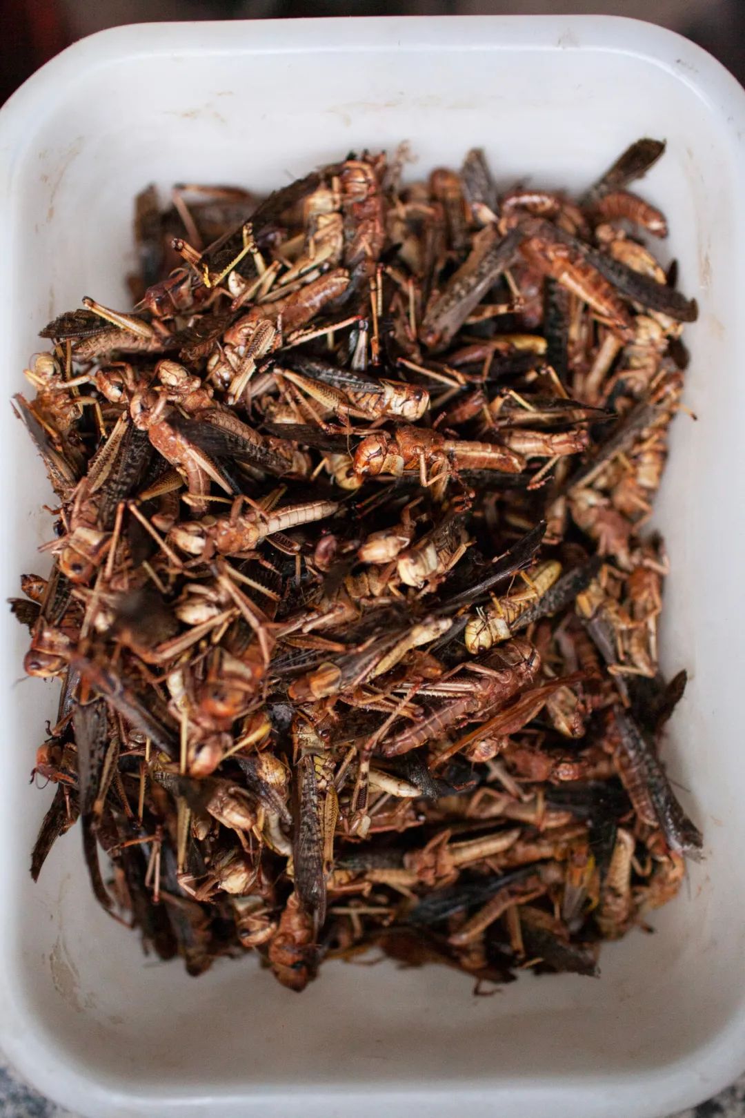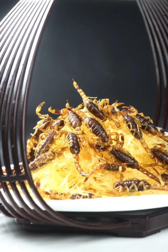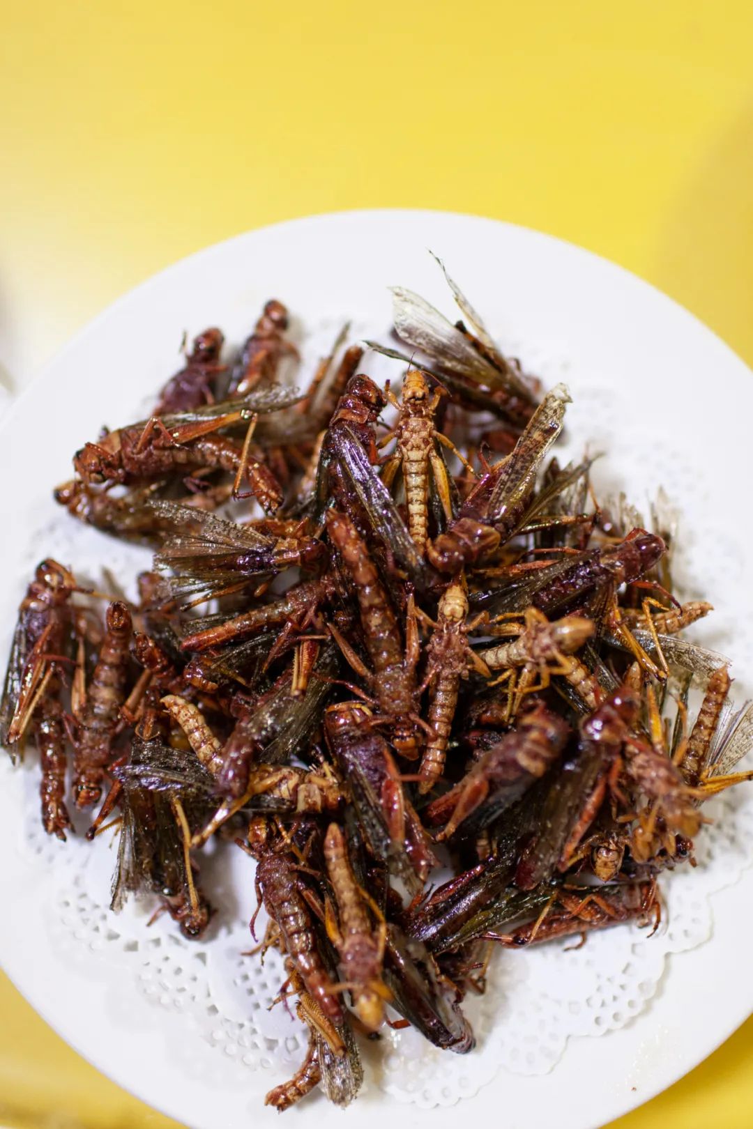 正是因为蛋白含量高,油炸昆虫跟油炸的肉类口感很像——不管生前什么色儿,油炸后通通色泽金黄,加上本身并没有什么怪味,口感酥脆,一口咬下去嘎嘎香。你要是问一个山东人,他可能会告诉你:“爪子吃起来像坚果,身体吃起来像鱼虾。”