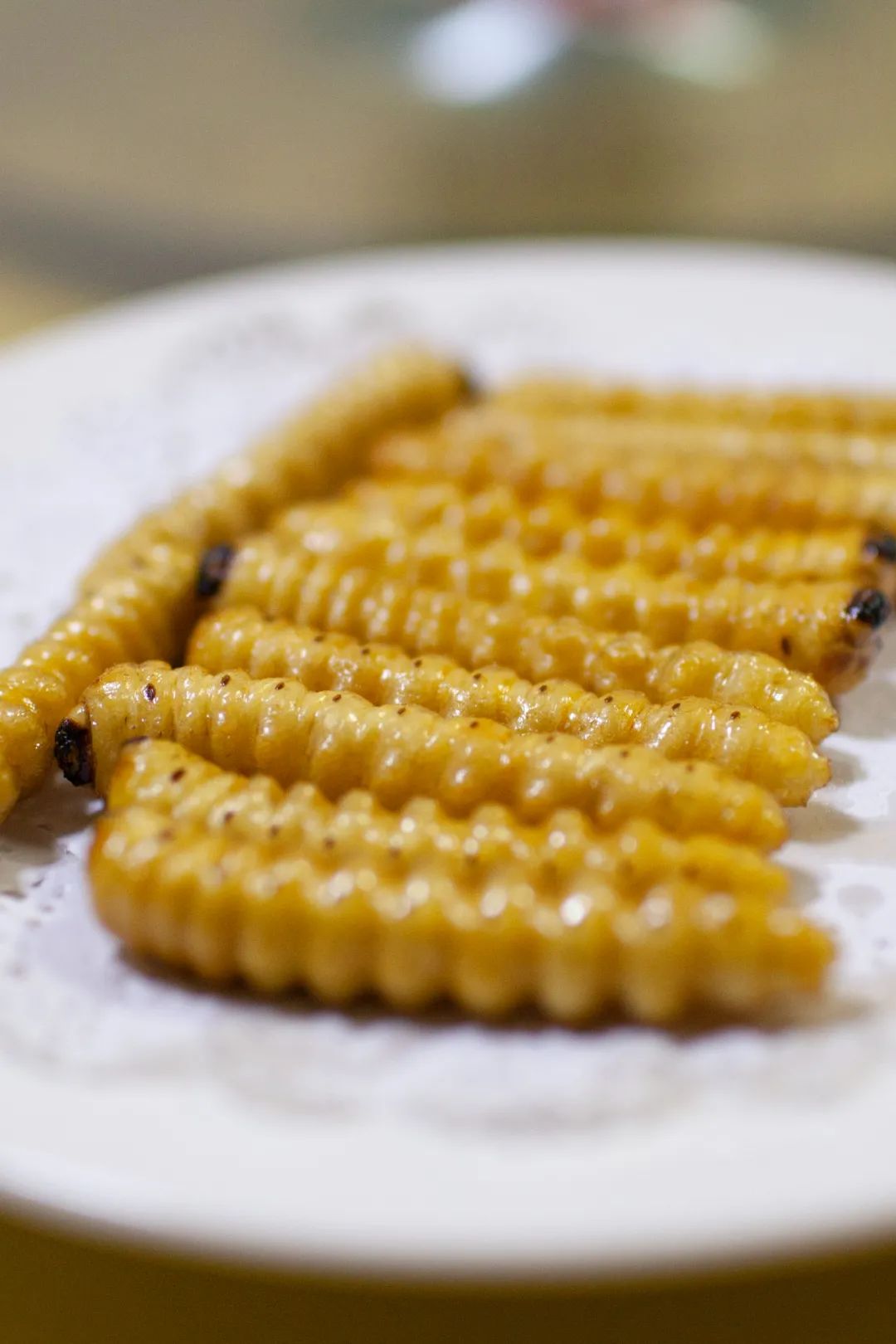 还有炒豆虫、粉皮豆虫、豆虫炒鸡蛋等烹饪方法,取的是一个鲜,入口清香,味道鲜美。不过这些做法都看不出豆虫的形貌了。而一条一条直挺挺地码在盘中、焦黄朴素的炸豆虫,恐怕永远是山东人心中的制高点。
