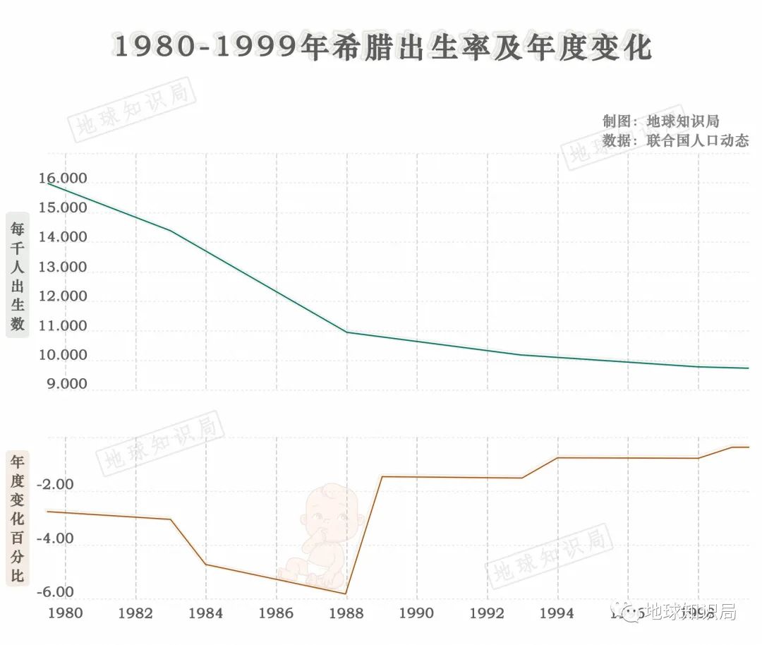不过,自上世纪80年代末以来,希腊的新生儿数量就一直呈显著下降趋势,人口自然增长率也不断下降。新生儿年出生数量从1980年的14.81万下降到1999年的10.2万,这也为新世纪希腊人口红利的逐渐消退,埋下了伏笔。