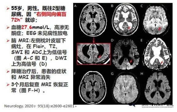 除此之外,Neurology去年发表了一例经典的非酮症高血糖高渗类卒中(图1)。提示少数高血糖也可以导致类卒中的发生。