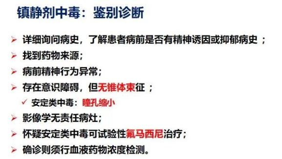 ②若遇到不明原因的意识障碍者,尤其缺乏锥体束征者,须排除是否存在镇静剂中毒。