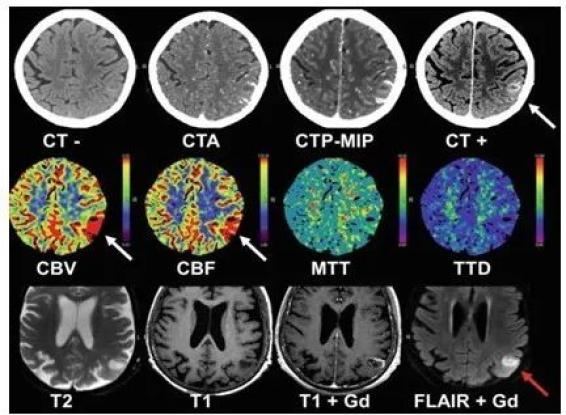 急诊脑CT示左侧局灶性病变,皮质曲线增强,血容量和血流量局灶性升高(白箭头),并显示正常到快速灌注转运时间。头MR-ALS增强和“高灌注”认为是亚急性梗死。