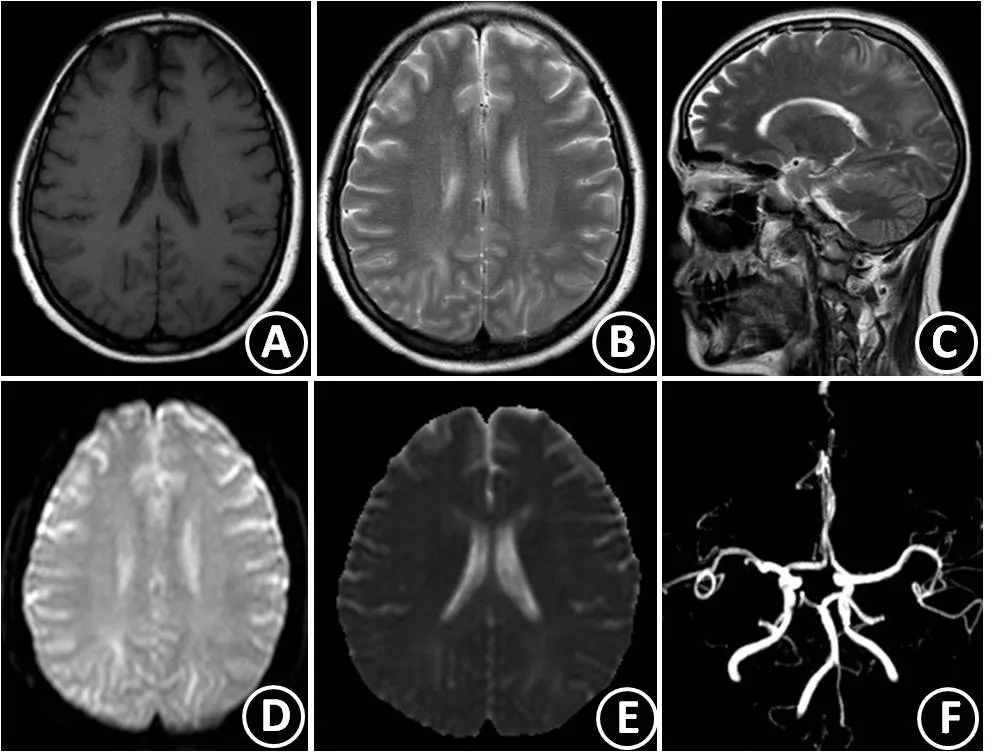 用甘露醇降压及其它对症治疗后,复查头颅MRI复查示双侧枕叶在T1WL(A)像的低信号,T2WI(B和C),DWI(D)和ADC(E)像的异常信号消失,TOF-MRA示颅内动脉未见异常(F)。