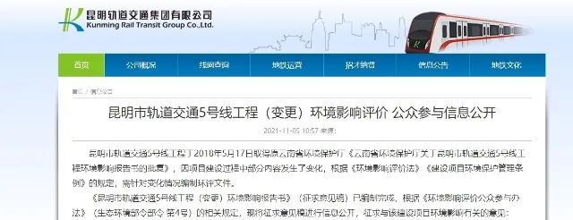 近日,昆明轨道交通集团有限公司发布《昆明市轨道交通5号线工程(变更)环境影响评价 公众参与信息公开》。对比“原环评报告书”及环评批复、初步设计批复,昆明市轨道交通5号线工程线路长度由25.9km增加至26.45km,线路增长0.55km;此外还有15座车站名称,8个站点结构类型发生变更。