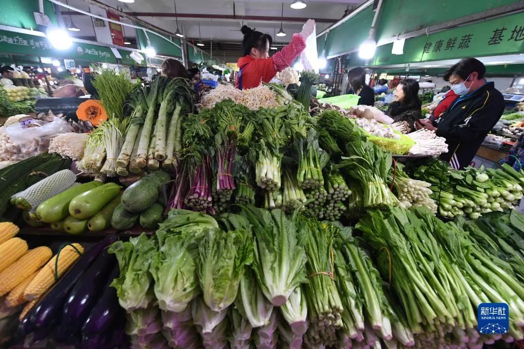 在广西南宁市滨湖路一家农贸市场,人们在选购蔬菜。