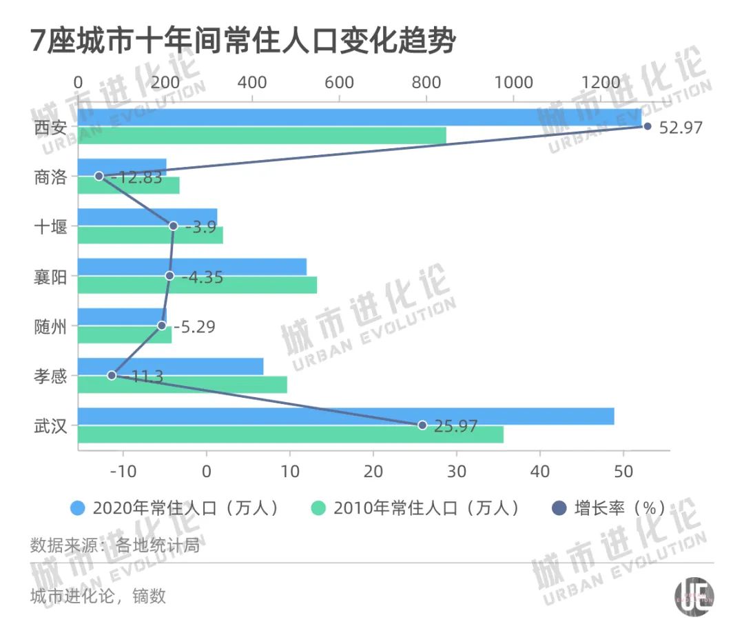 经济发展上的差距,也反映至人口流动上。七普”数据显示,2010年至2020年,西安和武汉人口增量分别为448.51万人和254.11万人,增幅分别达52.97%和25.97%。而处于中间地带的商洛、十堰、襄阳、随州、孝感5个城市均为负增长,人口分别下降30.05万人、13.18万人、23.94万人、11.43万人、54.42万人,最大降幅达到12.83%。