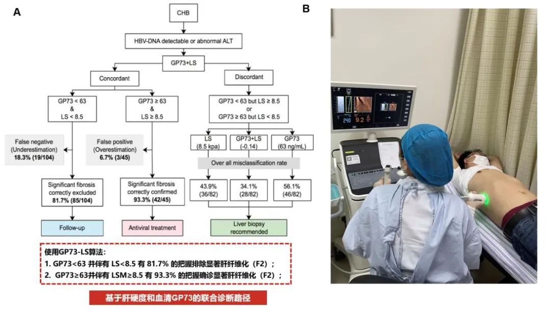 通过大量的临床病例检测,团队发现对于过度肥胖、大量腹水、孕产妇、有植入起搏器、右上腹有大面积创口、疤痕的患者来说,基于影像学的肝硬度检测存在局限性。通过进一步深入研究,感染科团队还发现,血清标志物GP73在肝纤维化无创诊断中的重要价值。于是,影像学与血清学珠联璧合,形成了无创诊断技术的优势互补,从而使临床显著性肝纤维化的预测准确度达90%左右。