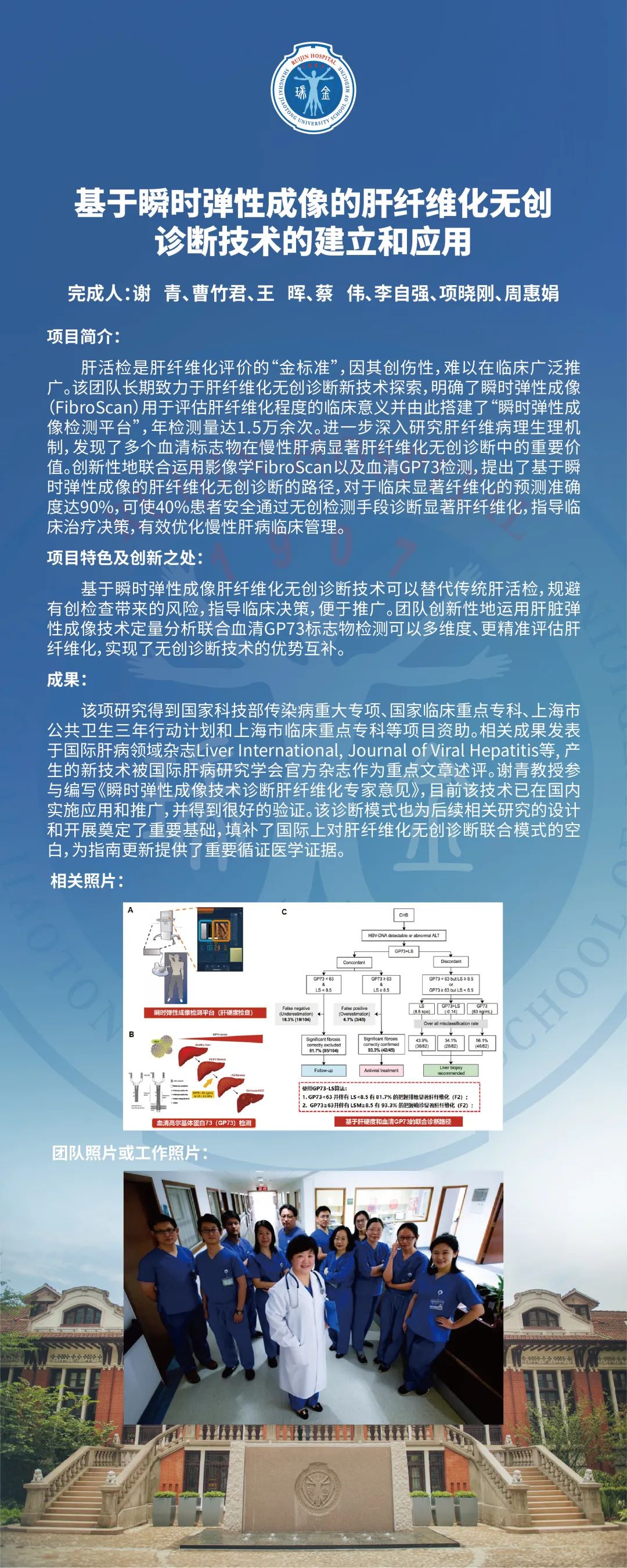目前,“瞬时弹性成像检测平台”年检测量达到1.5万次,血清GP73检测也已在重症肝炎研究室开展,该技术已经在长三角地区及瑞金感染科医联体单位进行了应用推广,该诊断模式也为后续相关研究的设计奠定了基础,填补了国际上对肝纤维化无创诊断联合模式的空白。