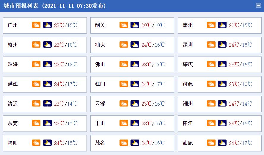 11日,东部市县晴天,西部市县多云间晴。最低气温:粤北市县6~10℃,其中高寒山区2~6℃;南部沿海市县12~16℃,其余大部市县10~12℃。
