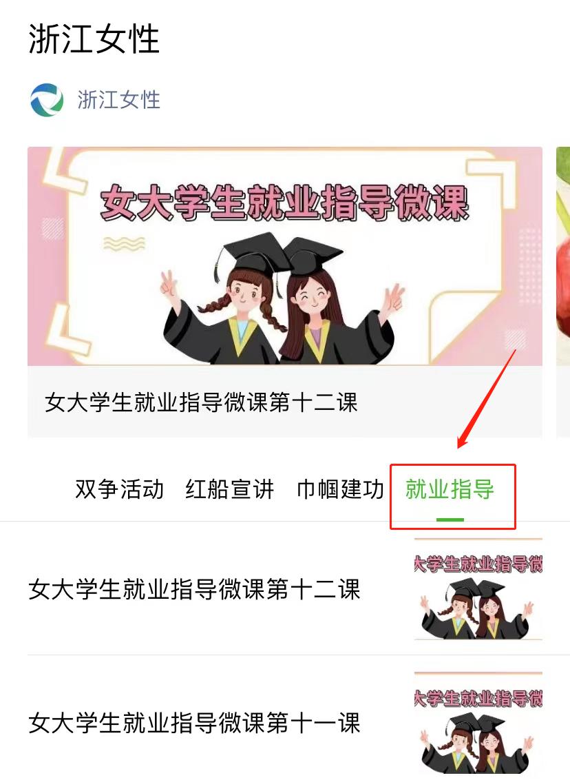 看到这里,小姐妹们是不是还有很多疑惑呢?别急!贴心的“浙江女性”还为你们准备了“女大学生就业指导微课”,快关注“浙江女性”官方微信公众号,回复关键词“就业指导”或点击“浙江女性”公众号菜单栏“最·精选”中的“工作专题”收看课程吧!