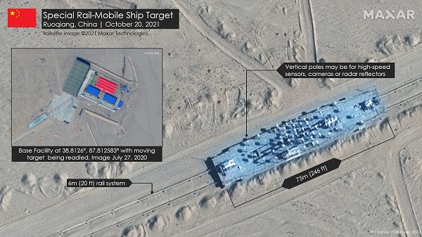 卫星图像公司Maxar于2021年11月7日为美国海军协会拍摄的照片显示,中国在新疆西部塔克拉玛干沙漠的导弹试验场精确模拟出了福特级航空母舰的甲板(但不包含舰岛上层结构和其他设备)。