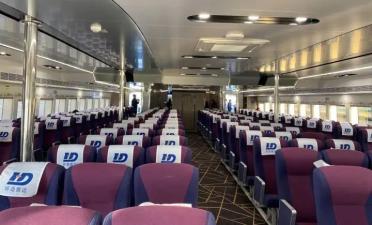 从西泽码头登上“普陀祥云”号客船,船舶外观简洁现代,船舶内饰舒适贴心,全景舷窗可以让乘客享受自然光线的沐浴。整艘船总长40.35米,型宽10.38米,载客280人,总投资3340万元,为舟山市首艘双体钢铝高速客船。据介绍,与单体客船相比,双体客船具有航速更快、空间更大,舒适性更好的优点。