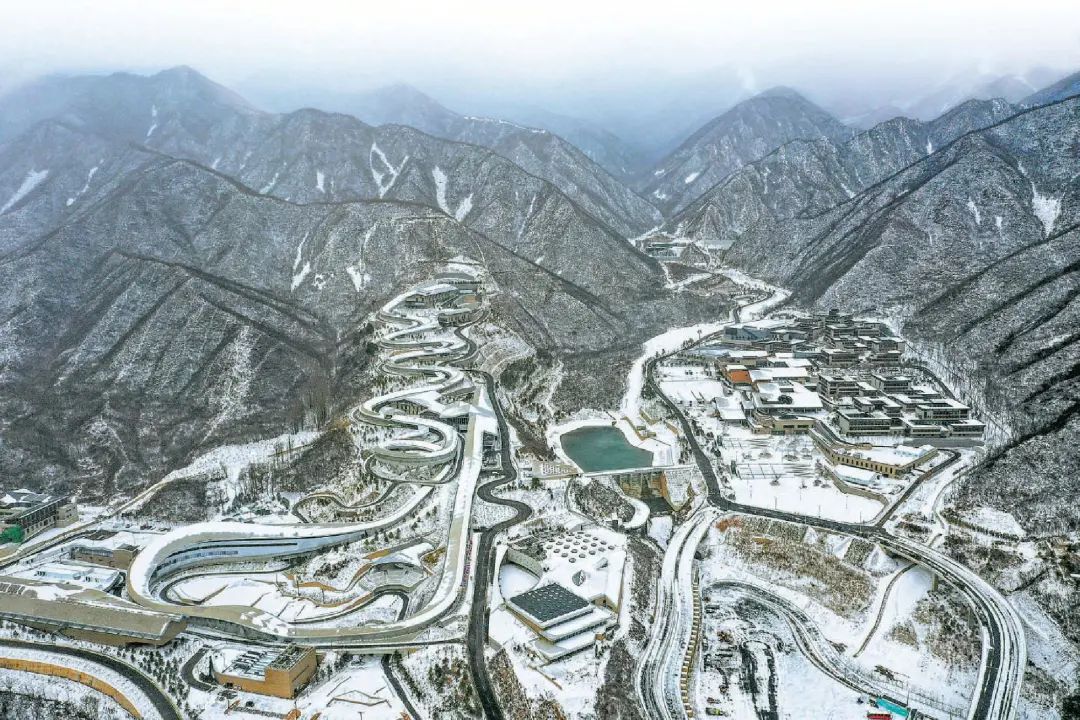 国家雪车雪橇中心采用了中华文化图腾“龙”的创意,16个角度、坡度不同的弯道,俯瞰下去正如一条蜿蜒的游龙盘踞在山脊之上,被形象地称为“雪游龙”。这是国内唯一一条雪车雪橇赛道,也是世界上唯一一条选址在山体南坡的赛道。