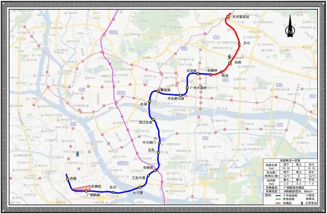 广州地铁十号线属市区加密线,东起天河区天河客运站,线路全长约25千米,全部为地下线,共设19座车站,全部为地下车站。