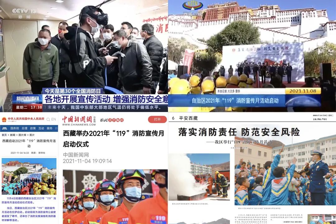 CCTV-12《见证》栏目推出系列纪录片《驯火记——千年布达拉》,全面展示西藏消防工作和队伍改革转隶成效,得到社会广泛关注,引发强烈反响。人民网西藏频道推出邓立刚总队长专题访谈《牢记训词精神、守护边疆安宁》,全面宣介西藏消防改制转隶成果,呼吁全民学消防保平安。CCTV-13播出2021年消防救援瞬间,西藏阿里燕尾山救援画面入选。CCTV-4报道西藏自治区“119”宣传月启动仪式。西藏日报头版推出西藏消防救援队伍改制转隶三周年综述《践行授旗训词精神、永做雪域忠诚卫士》、刊登全区“119”宣传月活动专版。西藏卫视新闻联播推出综合新闻《全国消防日,致敬逆火英雄!》,展示总队重大英模典型风采,播出全区消防宣传活动动态。西藏消防微信平台发起“你好,西藏消防”文创作品征集评选活动,征集各类消防文创作品100余件。总队、支队公众号推出新聘任消防宣传公益使者公益宣传视频、消防知识有奖竞答及网络直播活动,吸引消防粉丝广泛关注参与。各地消防救援部门大力推广“全民消防安全学习云平台” “消防志愿者注册管理平台”,倡导全民学习传播消防知识。