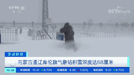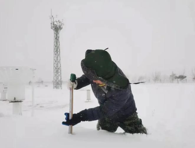 为确保观测工作正常运转,库伦旗气象局的观测员在及膝深的雪地里艰难前行,执行雪深与冻土观测工作,清理设备上覆盖的积雪。