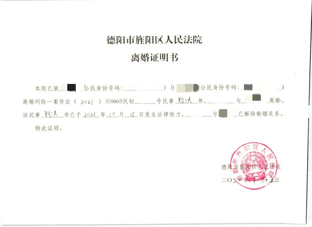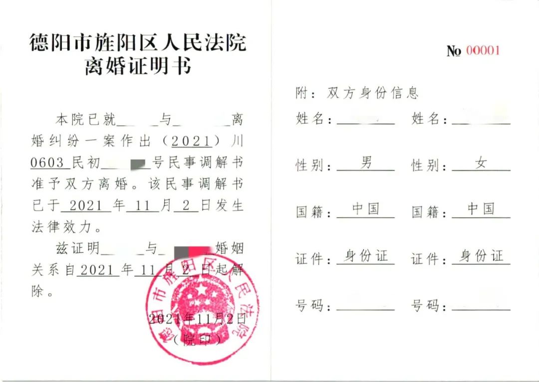 2021年10月22日,旌阳区法院按照省高院统一制式更新了《离婚证明书》的内容和格式。截至今日,共发出新版《离婚证明书》7份。