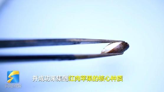 为解决口感问题,陈学森把新疆红肉苹果花粉带回山东,与口感脆甜的红富士等苹果品种杂交,在冠县种植基地,定植了40个杂交组合、5万多株苹果苗。