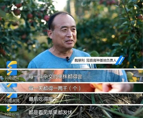 冠县育种基地负责人魏景利说:“每一年杂交的单株都得尝,每一天都得一两千(个),最后吃得嘴,都是看见苹果都发怵,脸也哆嗦,眼也哆嗦,有点条件反射。”