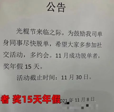 8)近日,上海一公司贴出的“脱单公告”,为鼓励单身同事脱单,希望大家多参加社交活动。并且老板承诺:双十一脱单者,奖15天年假,活动截止到11月底。
