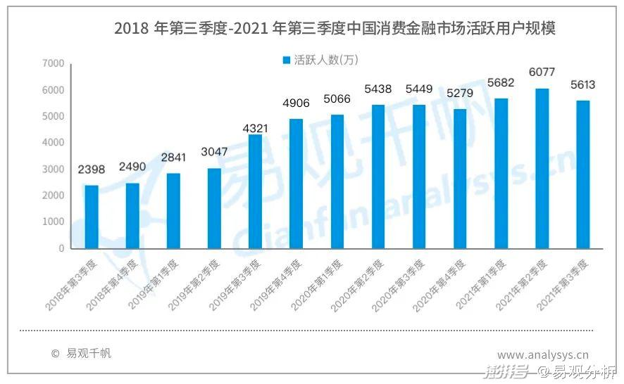 根据易观千帆数据显示,消费金融行业2021年第三季度活跃人数为5613.3万人,环比有所下降,但同比来看仍增3%。易观分析认为,上述现象一方面受季度内用户消费需求回落,另一方面受“双减”政策约束的部分行业场景收缩等多重因素影响。