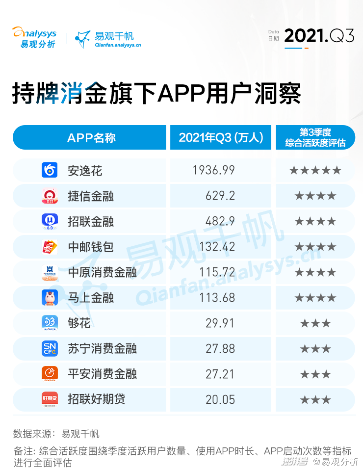 具体到持牌消金APP应用层面,活跃用户呈现出明显的分化之势,马上消费金融旗下安逸花APP季度活跃用户数突破千万级别,招联金融、捷信金融、中邮钱包等季度活跃用户位于数百万行列。根据季度活跃用户数量、季度用户使用APP时长及季度APP启动次数等主要指标对持牌消费金融公司旗下APP活跃度进行综合考量,主要消金机构获得的星级评分结果如下: