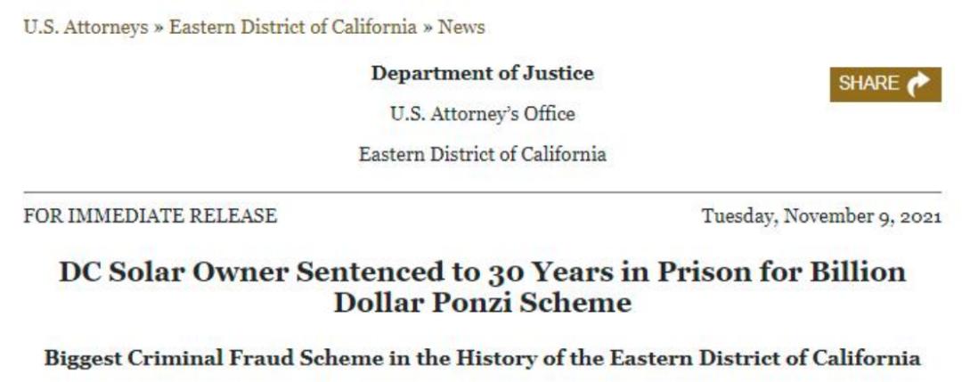据美国检察官表示,这起“庞氏骗局”是加州东部地区史上规模最大的欺诈案件,时间跨度接近8年,涉及35个投资基金、至少17个受害投资方,诈骗金额接近10亿美元,并让美国纳税人蒙受数亿美元的税收抵免损失。