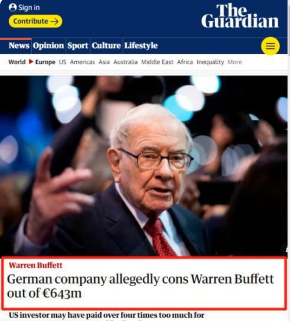 其实,这并非巴菲特“踩雷”的第一起诈骗案。就在2020年5月,英国《卫报》报道,巴菲特被一家德国制造企业设局坑骗了6.43亿欧元(约合人民币50亿元)。