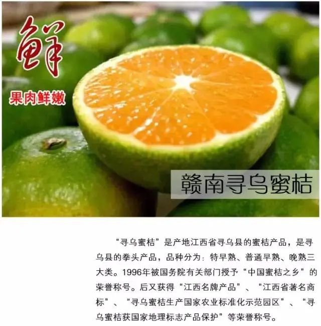 寻乌蜜桔是国家地理标志保护产品、中国驰名商标,是寻乌县的拳头产品。由于寻乌气候独特,昼夜温差大、无霜期长、土壤深厚,非常适应蜜桔的种植。寻乌蜜桔具有皮薄、色鲜、果形好、质脆化渣、清香无核、风味浓厚等特点,深受消费者喜爱。