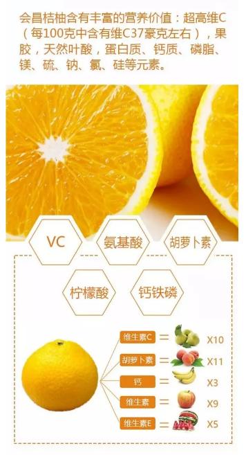 桔柚是杂交培育而成的柑橘类新品种,既具有桔子鲜甜多汁的特点,又具有柚子清香爽口的特点。皮厚容易保存,并且食用后不上火。会昌气候温和,日照充裕,水土资源丰富,有着发展桔柚产业得天独厚的条件,是全国桔柚的主产区。2016年,会昌桔柚被批准为国家地理标志保护产品。