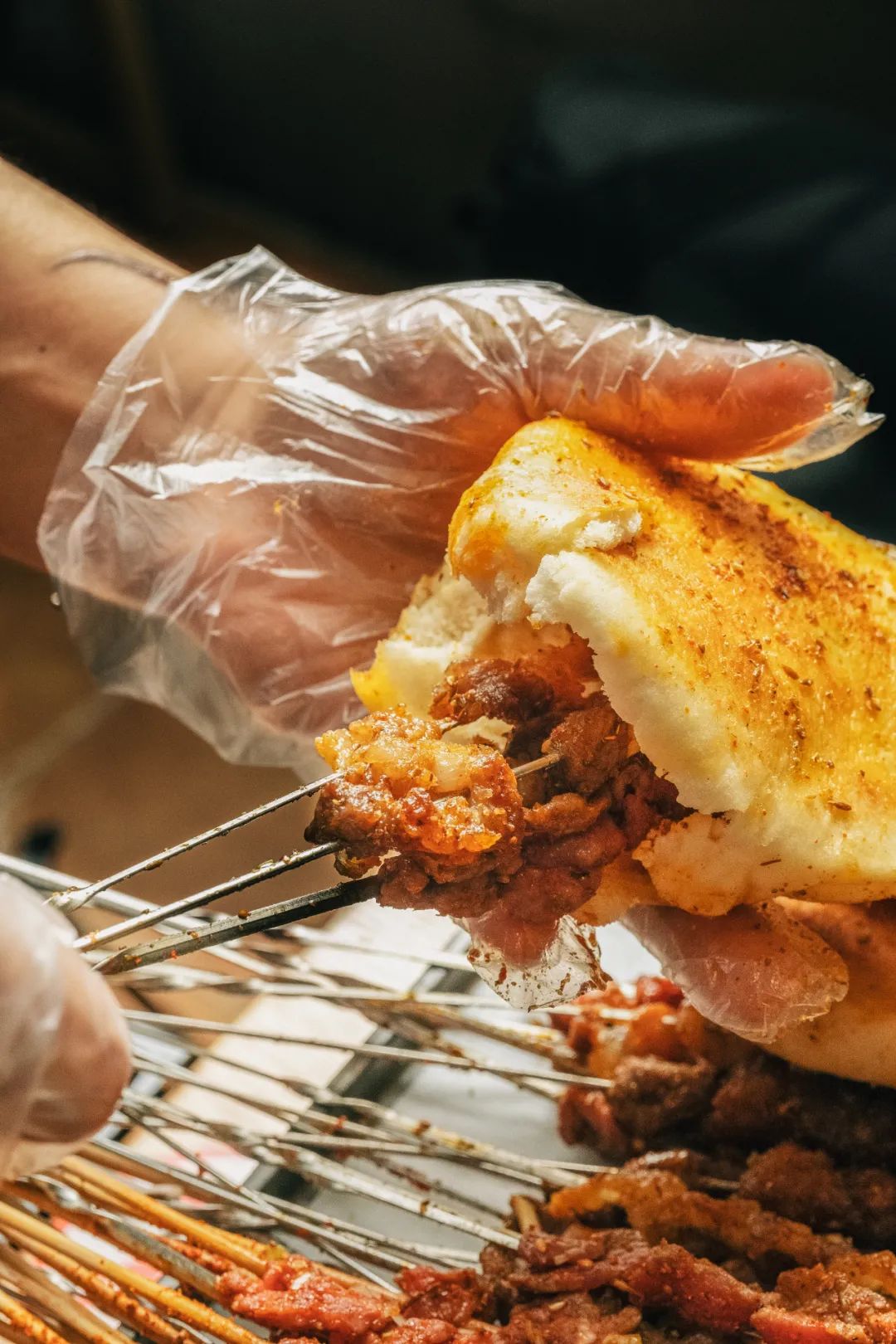鹤岗小串特色:烧饼夹着肉吃