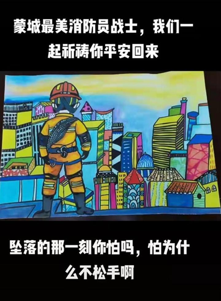 对此,不少网友为消防员的生命安危揪心,还有网友画出一幅消防员的画,为他祈福。