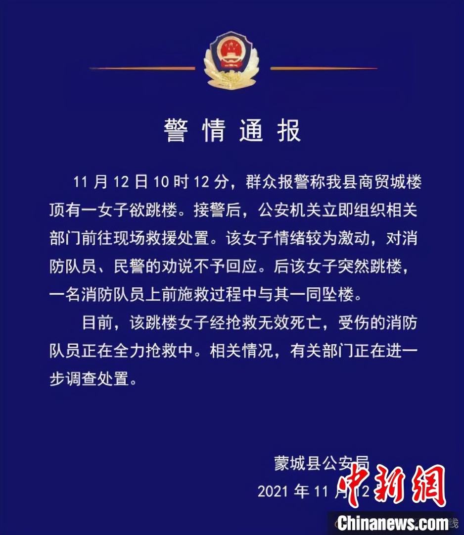 12日晚8时58分,安徽省亳州市蒙城县公安局官方微博发布通报称:11月12日10时12分,群众报警称我县商贸城楼顶有一女子欲跳楼。接警后,公安机关立即组织相关部门前往现场救援处置。该女子情绪较为激动,对消防队员、民警的劝说不予回应。后该女子突然跳楼,一名消防队员上前施救过程中与其一同坠楼。