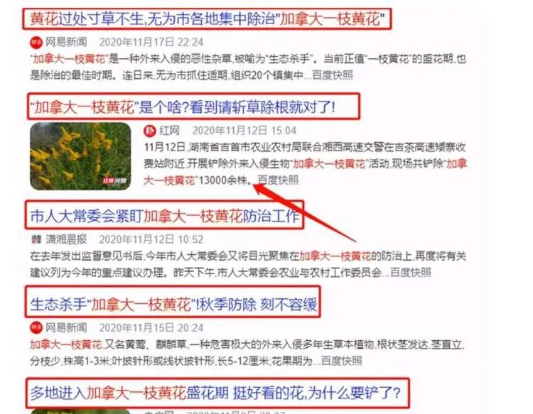 其实,在这次上热搜榜之前,加拿大一枝黄花早就成名,而且几乎都是“臭名昭著”的形象。搜索网络可以发现,各地围剿加拿大一枝黄花的新闻从多年前开始就出现了,关于加拿大一枝黄花的科普知识也较为丰富。