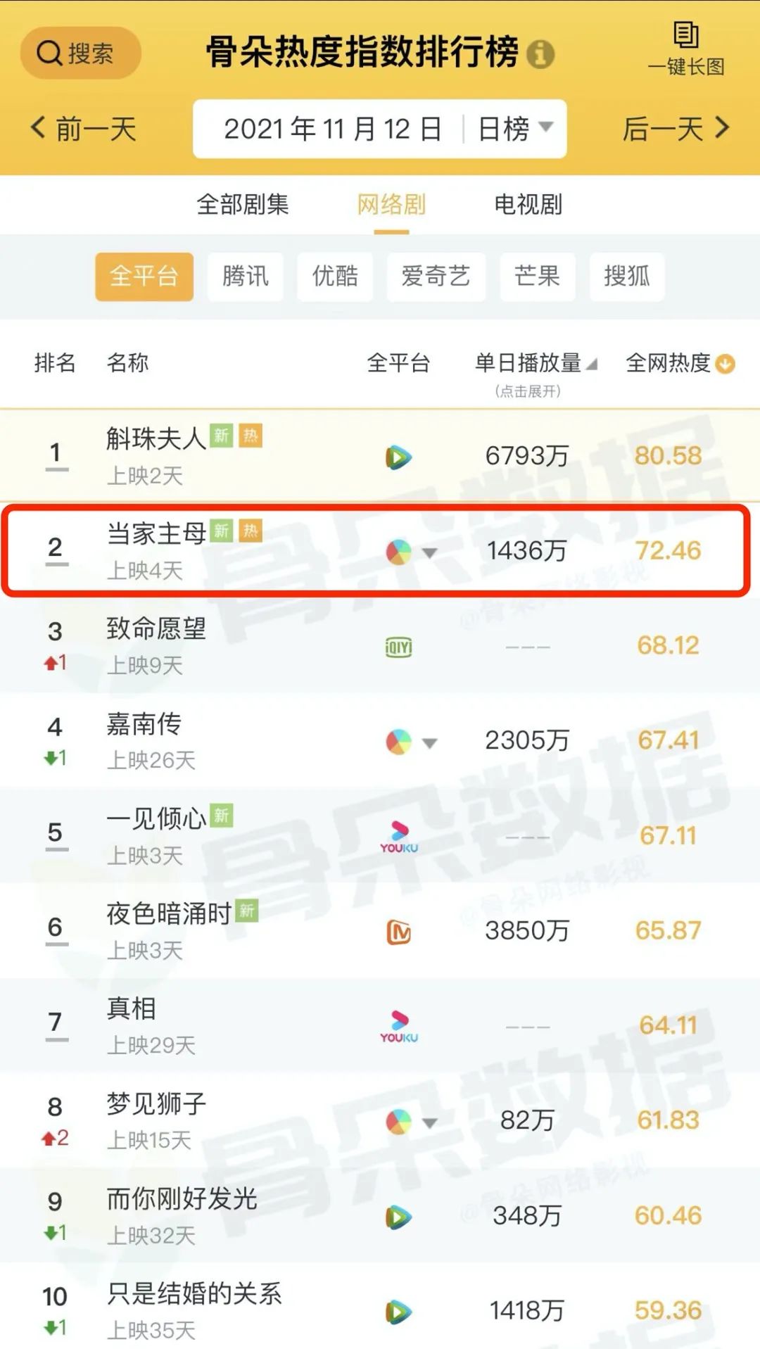 这其中,集合了经营、家宅、爱情元素的“中年偶像剧”必有一席之地。今年年初,钟汉良主演的《锦心似玉》热度默默登顶,攻占熟龄市场;前不久,刘涛、林峰主演的《星辰大海》仅凭“马景涛式”撕心裂肺的告白戏就一夜出圈,让湖南卫视的黄金档打了一场翻身仗;最近,是欢娱出品、蒋勤勤、杨蓉主演的《当家主母》开始发力,首周播出后连续三天维持在骨朵网剧热度榜亚军的名次。
