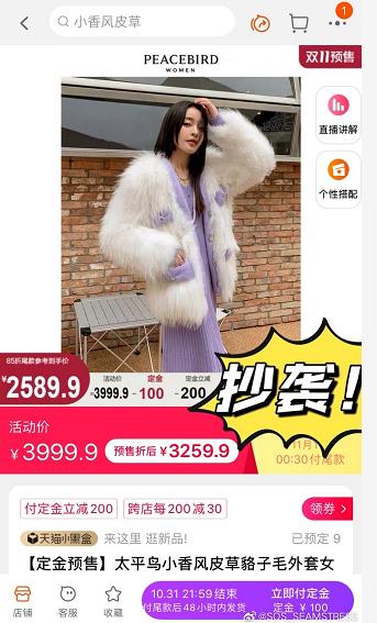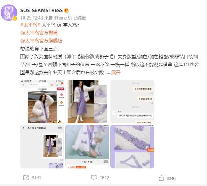 10月25日,一名被认证为时尚博主的微博用户发布消息称,太平鸟官方旗舰店双十一期间预售的小香风皮草貉子毛外套“1:1抄袭”了自己的店铺去年冬天上架的一款原创设计外套。该博主表示,太平鸟除了将滩羊毛的面料材质改成貉子毛以外,“大身版型/颜色/颜色搭配/蝴蝶结口袋细节/扣子/甚至四颗不同扣子的位置一丝不改,一模一样”。