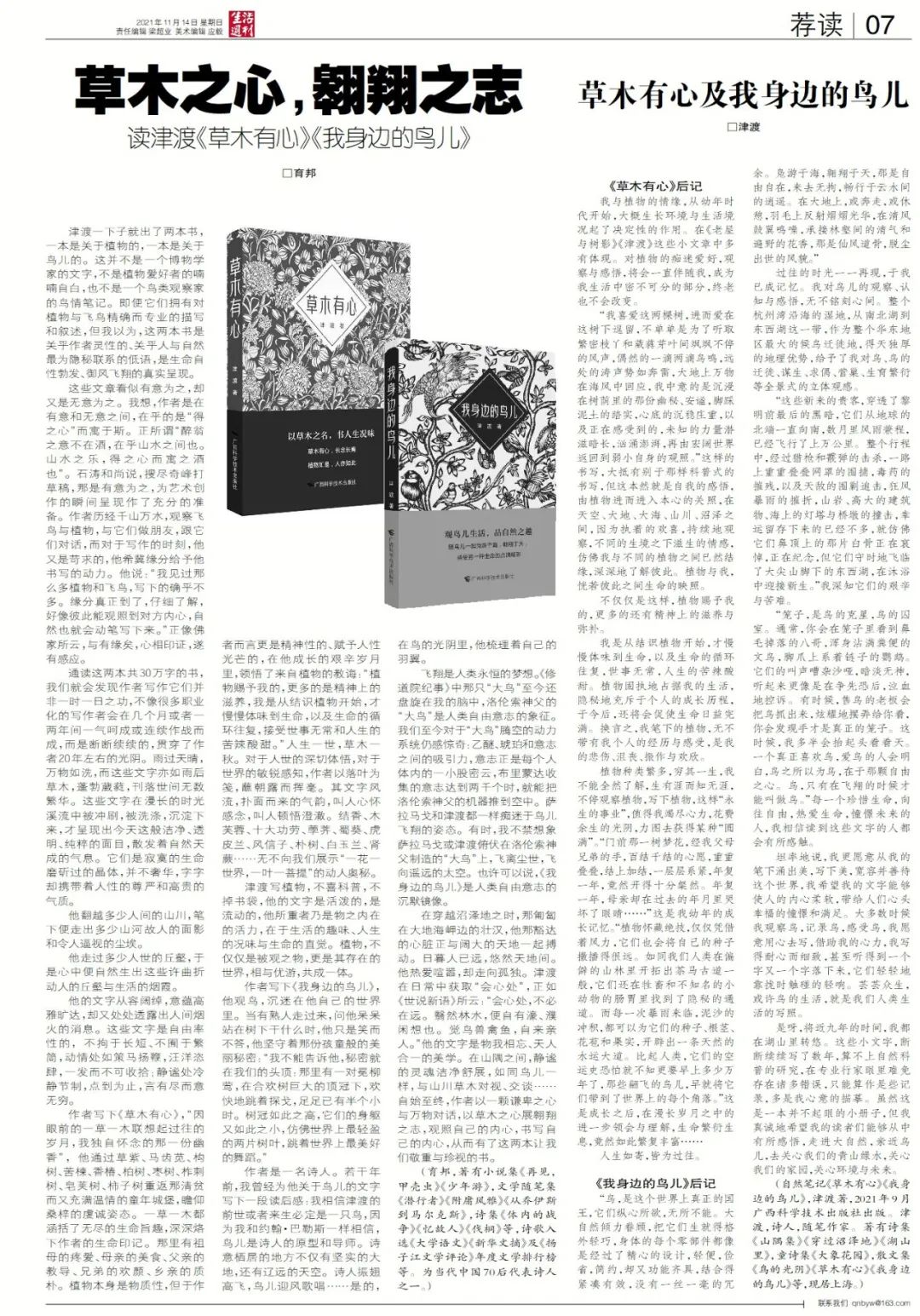 原标题:《荐读 | 育邦:草木之心,翱翔之志 / 津渡:草木有心及我身边的鸟儿》