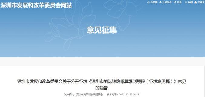 2021年10月22日,深圳市发改委发布《深圳市城际铁路概算编制规程(征求意见稿)》。
