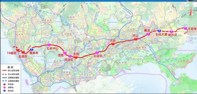 线路起于深圳机场T4枢纽站,经石岩、龙胜、五和、白泥坑、大运、坪山,止于聚龙,线路全长约69公里,设站11座。