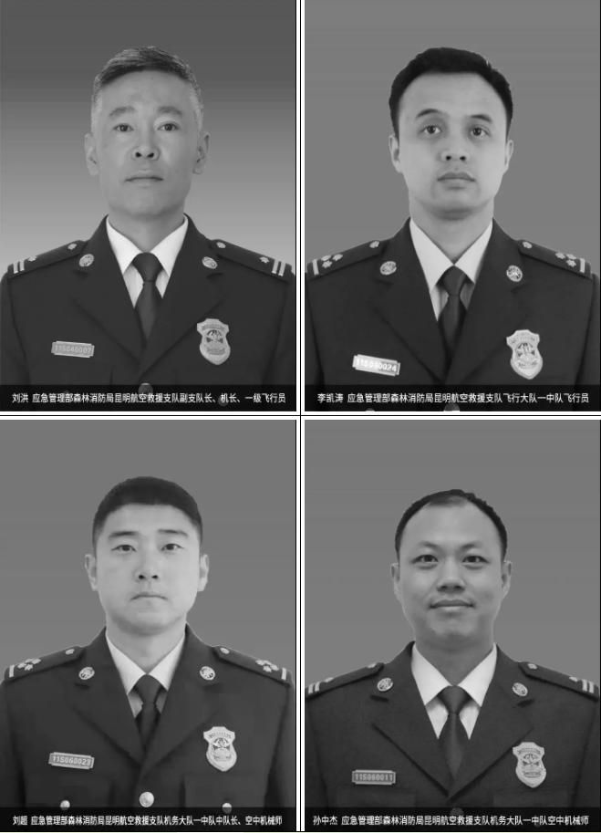 2021年5月10日,应急管理部森林消防局昆明航空救援支队“刘洪机组”执行高山悬崖火点灭火任务,在吊桶取水作业中因直升机突发特情坠入洱海,4名机组人员壮烈牺牲。
