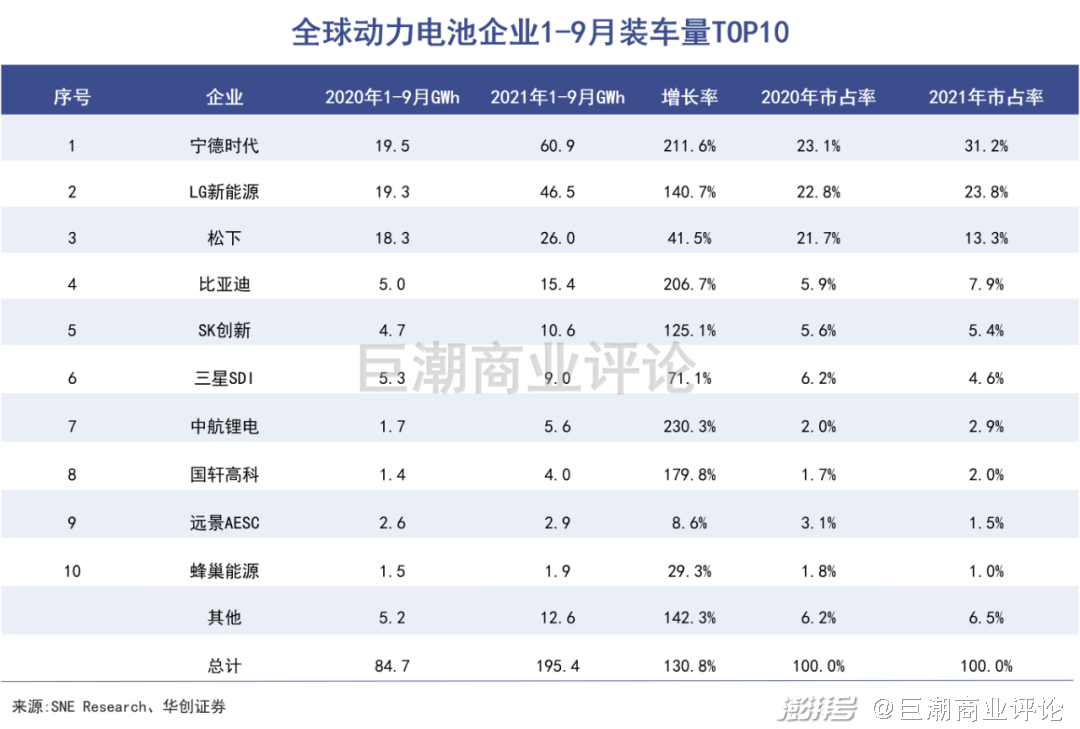 2020年亿纬锂能装机量1.1GWh,市占率仅有1.1%;不过在2021年,凭借和戴姆勒、起亚、小鹏汽车的合作放量,1-9月的动力电池出货量达到0.96GW,市占率到了1.8%。