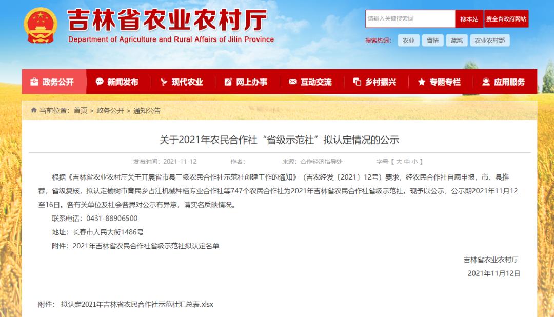 近日,吉林省农业农村厅发布了关于2021年农民合作社“省级示范社”拟认定情况的公示。拟认定747个农民合作社为2021年吉林省农民合作社省级示范社。公示期为2021年11月12至16日。