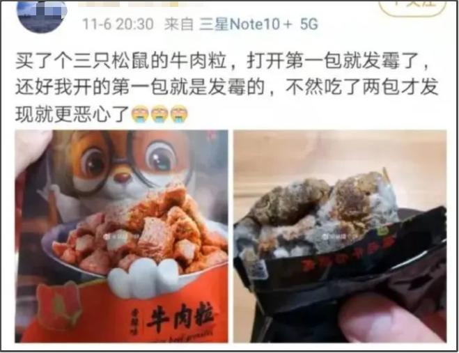 11月6日,网友“咪嘞个咻”投诉,“买了个三只松鼠的牛肉粒,打开第一包就发霉了”。从其配发图片看,牛肉粒大面积发霉长毛。