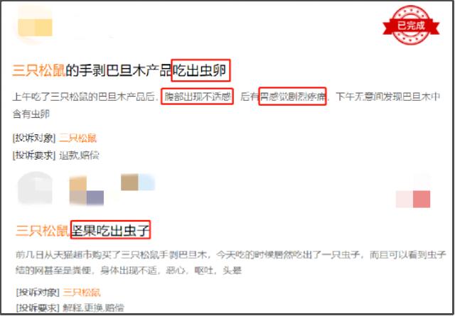 黑猫投诉平台上的投诉也涉及产品发霉变质、长毛、“水果罐头吃出虫子”,巴旦木产品“吃出虫卵”等问题: