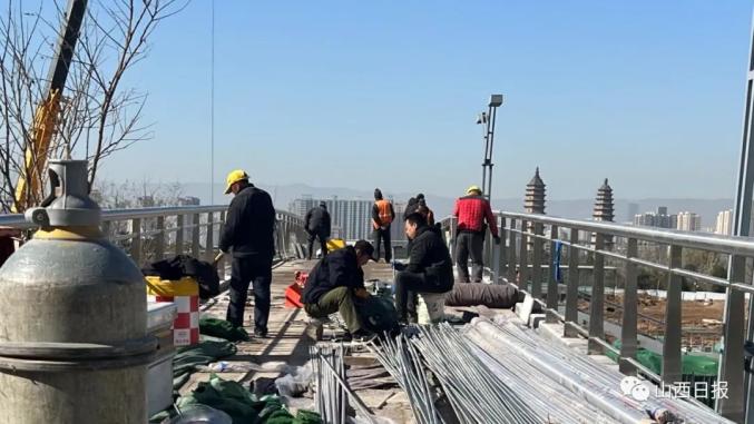 11月12日,太原市东中环双塔公园东门人行天桥施工现场,焊花飞溅,一派忙碌。工人们安装护栏、铺设砖块,工程进入收尾阶段。该处天桥主桥长约95米,桥面宽度达4米,预计本月中旬能够完工。届时,太原今年修建的10座天桥将全部投入使用。
