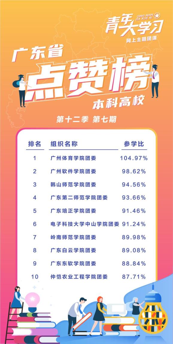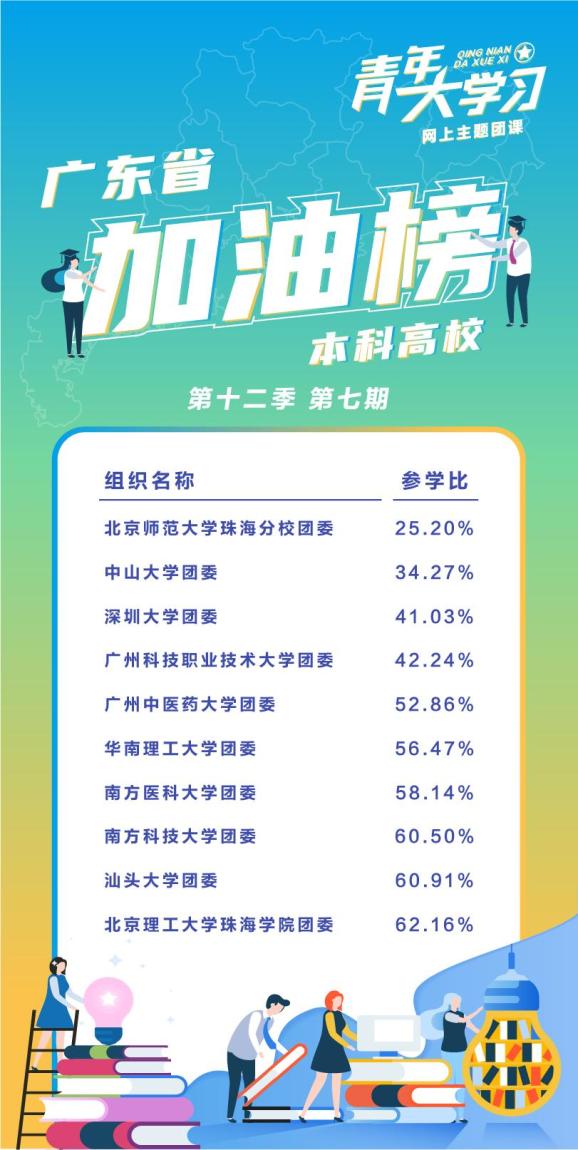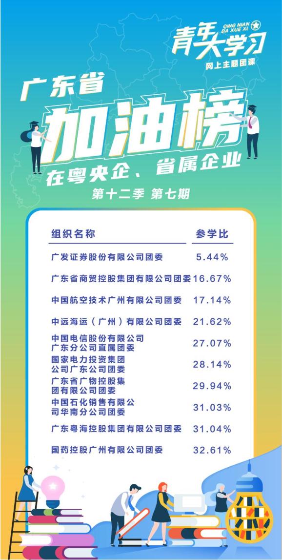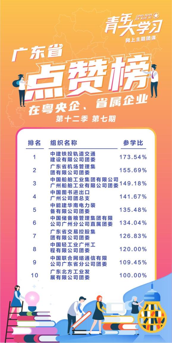 从在粤央企、省属企业总参学情况看,中建铁投轨道交通建设有限公司、广东省机场管理集团有限公司、中国船舶工业集团有限公司广州船舶工业有限公司、中国图书进出口广州公司、中能建华南电力装备有限公司、中国储备粮管理集团有限公司广州分公司、广东省交易控股集团有限公司、中国轻工业广州工程有限公司、中国联合网络通信有限公司广东省分公司、广东北方工业发展有限公司等10家企业参学比超100%,“青年大学习”参学工作有序推进。